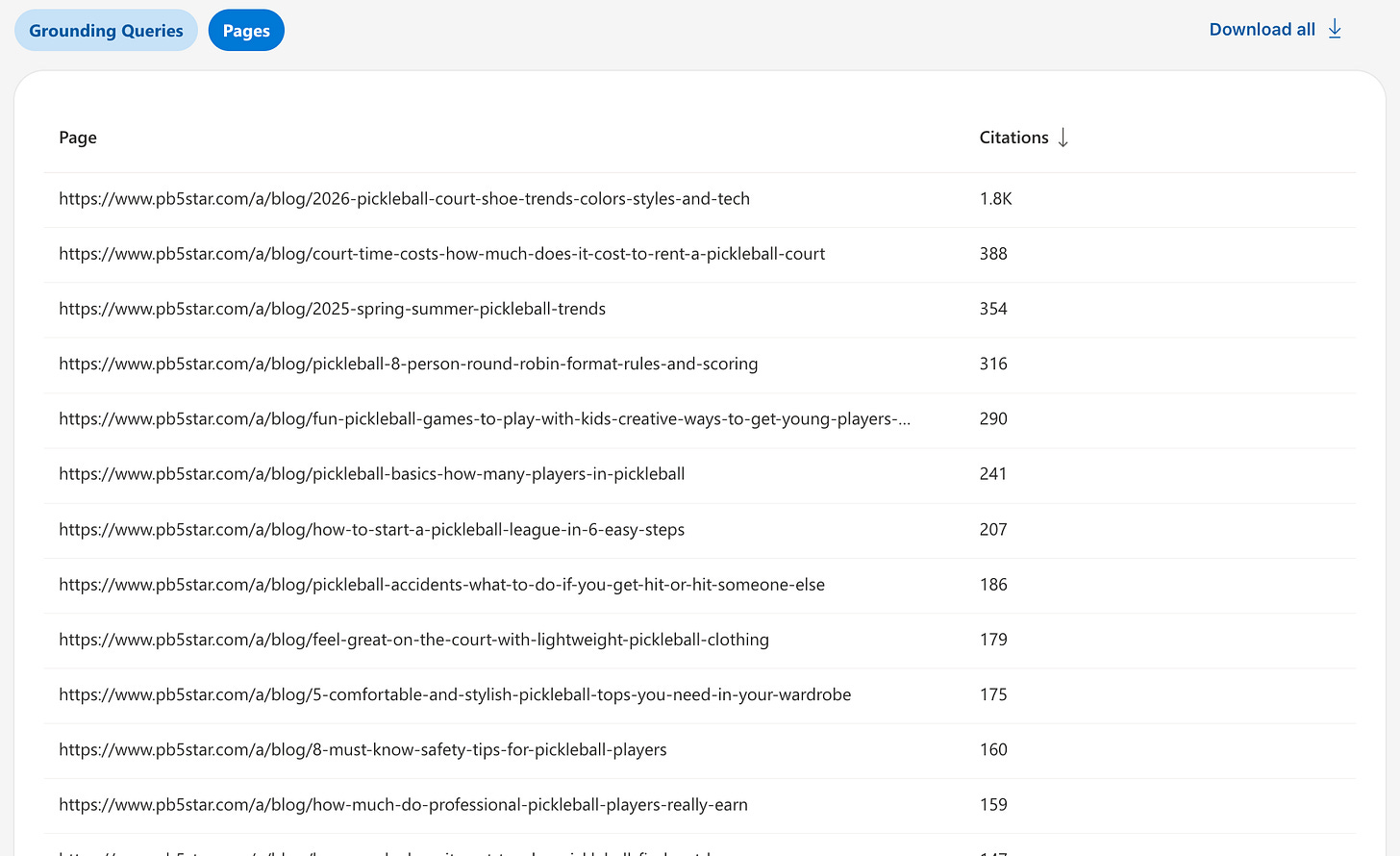 A breakdown of which URLs on your site are being cited and how often. In most early accounts, a small number of “hero” pages drive a large share of total citations. (joeyoungblood.com)